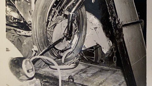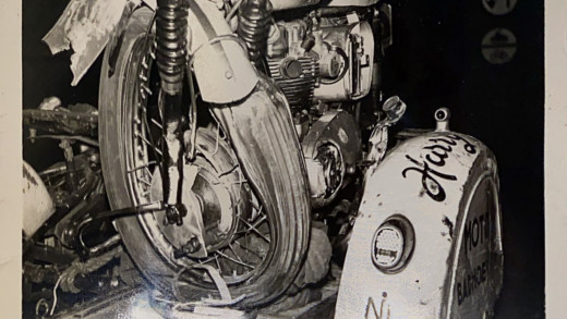 “Op zondags gingen we altijd met een aantal fervente Triumph rijders touren. Geregeld gingen we naar een speeltuin voor een kopje koffie en maakte dan gebruik van de speeltoestellen, zo ook die bewuste zondag. Toontje, één van onze maten was altijd voor een geintje te porren. Jan de Dood, een collega van mij had de week ervoor aan Toontje verteld dat hij rijdend op zijn buddyseat kon staan met een snelheid van 80 km per uur. Die zondag na enig vertier in de speeltuin reden we met de groep ter hoogte van ‘De Kromhout Kazerne’ in Utrecht. En ja hoor, wat dacht je, haha, Toontje ging op zijn buddyseat staan. Het ging een hele tijd goed totdat een windvlaag hem van zijn motor afblies. Toontje ging een paar keer over de kop maar stond wonder boven wonder weer op zonder ernstige verwondingen. De motor reed door met een snelheid van 80 km per uur. Hij ging een beetje naar de zijkant van de weg en raakte licht met de voetsteun een paaltje, herstelde zich en ging weer de weg op, haha. Dit ging zeker 800 meter goed. De motor week plots naar de zijkant van de weg, daar stond een betonnen wand van een brug. De Triumph knalde frontaal op de wand met als gevolg, de schade die je ziet op de foto. Toontje’s broek was aan flarden en op zijn benen zaten schaafwonden. Mijn schoonzuster Grietje, droeg, zeker met koude dagen, twee motorbroeken over elkaar. Ze gaf er één aan Toontje zodat hij niet met blote benen bij één van ons achterop de motor hoefde, haha! Beduusd hebben we ergens een kop koffie gedronken, plan de campagne gemaakt en naar huis gereden. We spraken af om de volgende dag de motor te gaan ophalen, met de Harley.