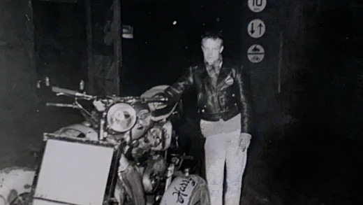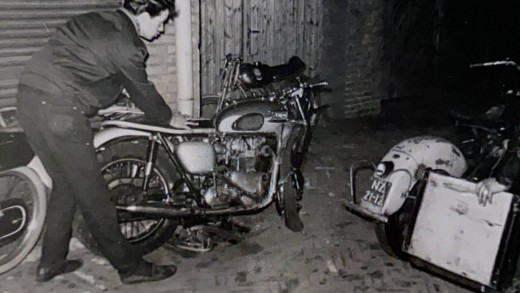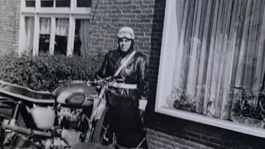 Zo geschiede, daar aangekomen bleek de motor weg te zijn. Een man wist ons te vertellen dat hij was opgehaald door de politie. We zijn naar het politiebureau gereden waar volgens de man de motor zou moeten staan en ja hoor! Daar stond hij. Toontje kreeg hem mee na het tonen van zijn kentekenbewijs. We hebben hem op de Harley geladen. Ik was de berijder, Toontje zat op de Truimph en Jan de Dood zat op het achter spatbord van de Harley. Ik vond het prachtig, wij, de drie musketiers. Het was inmiddels laat in de avond voordat we vertrokken naar huis. Ter hoogte van Amstelveen zijn we ook nog eens betrokken geraakt bij een ongeluk. Later bleek dat het achterlicht van de Harley stuk was. Een auto achter ons wilde gaan inhalen maar zag op het laatste moment dat het een motor met zijspan was. De automobilist kon ons nog net ontwijken maar zag de tegenligger niet, deze raakte hij aan de zijkant van de auto met flinke schade als gevolg. We zijn ons kapot geschrokken. Gelukkig bleek het alleen maar materiële schade te zijn. Binnen een uur verscheen de politie en werden we meegenomen naar het bureau voor verhoor. Daar moesten we uitleggen wie waar zat, want met z’n drieën op één motor! Hoe dan? Ze begrepen er helemaal niets van maar lieten ons toch gaan zonder bekeuring. Haha, wat een mooi verhaal niet?”